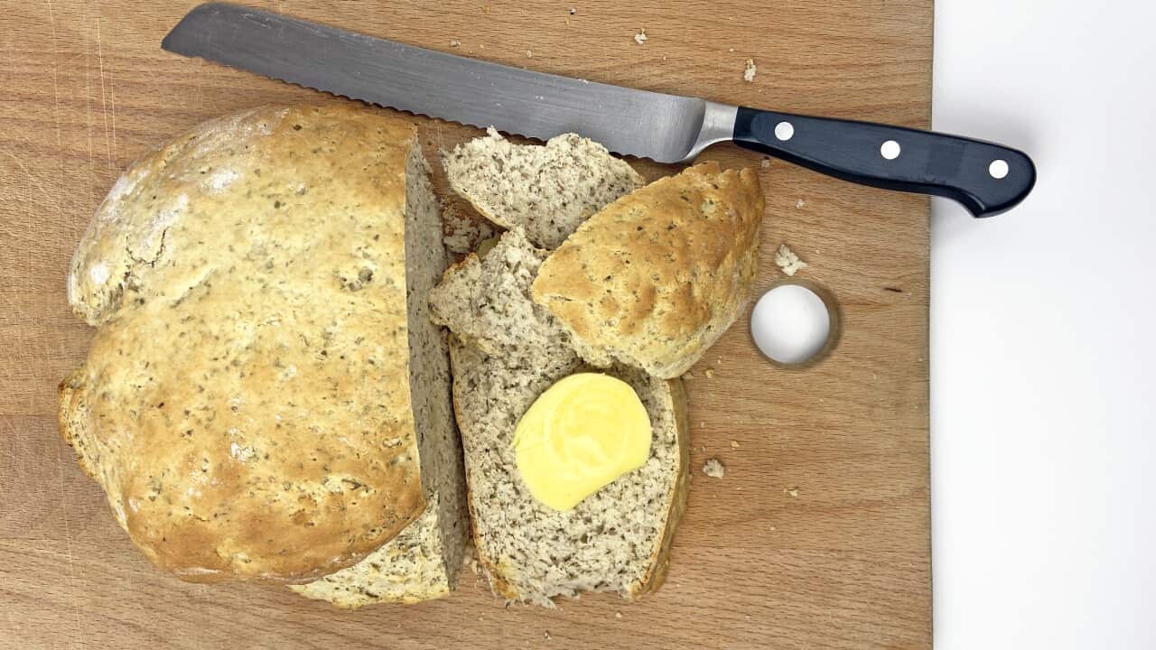 Chocolate lovers, this one's for you: Mark Olive’s lemon myrtle chocolate damper. The dough is rolled out into a rectangle and covered with bits of lemon myrtle chocolate then rolled into a log. A dusting of dried lemon myrtle and caster sugar goes on top before baking. It makes for an easy but indulgent breakfast or brunch.