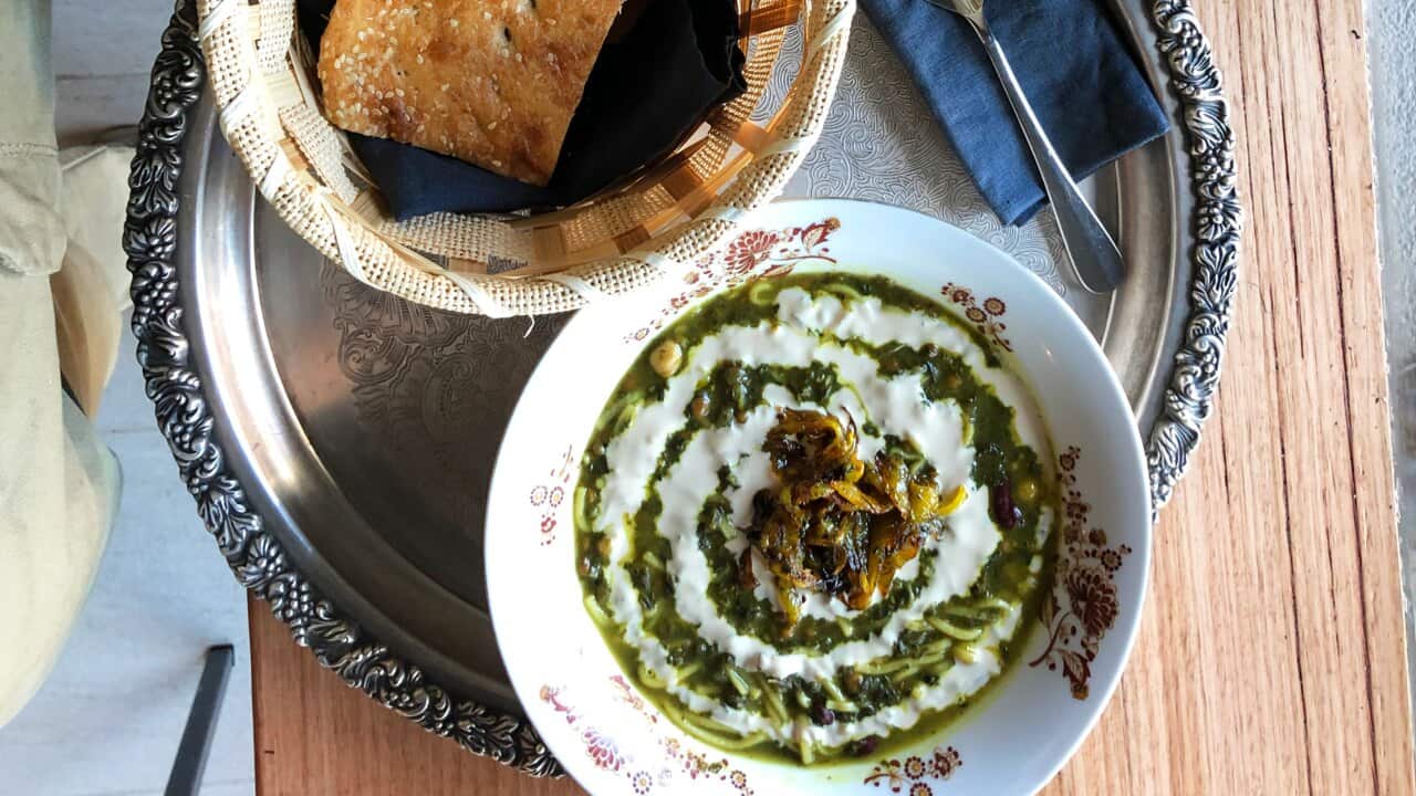 Iran's saffron is some of the world's best, and if you're familiar with traditional Persian ingredients, you'd know it features in both the cuisine's sweet and savoury dishes. It's critical that the saffron in this recipe is ground with a mortal and pestle, and blooms in hot water. This is what gives the sholeh zard its striking yellow colour and the aroma that I associate with my family home.