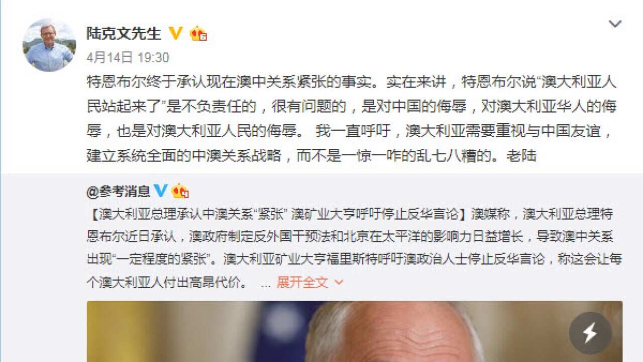 談到澳中關係,陸克文指出:「澳中關係最近遭遇一些麻煩,但這些麻煩亦有著其他的因素在內 - 中美之間的麻煩。」他認為,中美之間應意識到雙方的共同點及差別,並重視雙方的共通點,以此作為互相信任、彼此有信心的基礎。他認為,若兩個國家之間存有這樣的問題,應在正確的範圍內開始互相合作,但美國總統特朗普最近卻發起「貿易戰」。