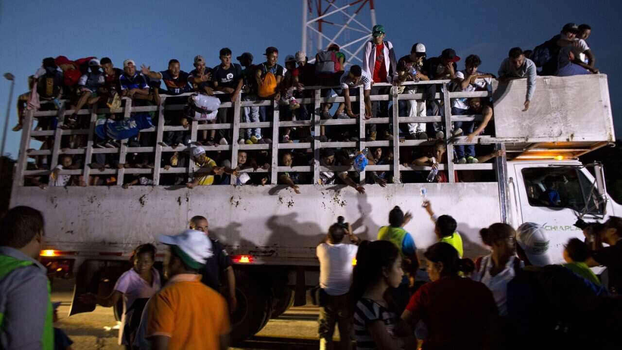 Men pass up water to Central Americans riding on the back of a truck. Source: AAP