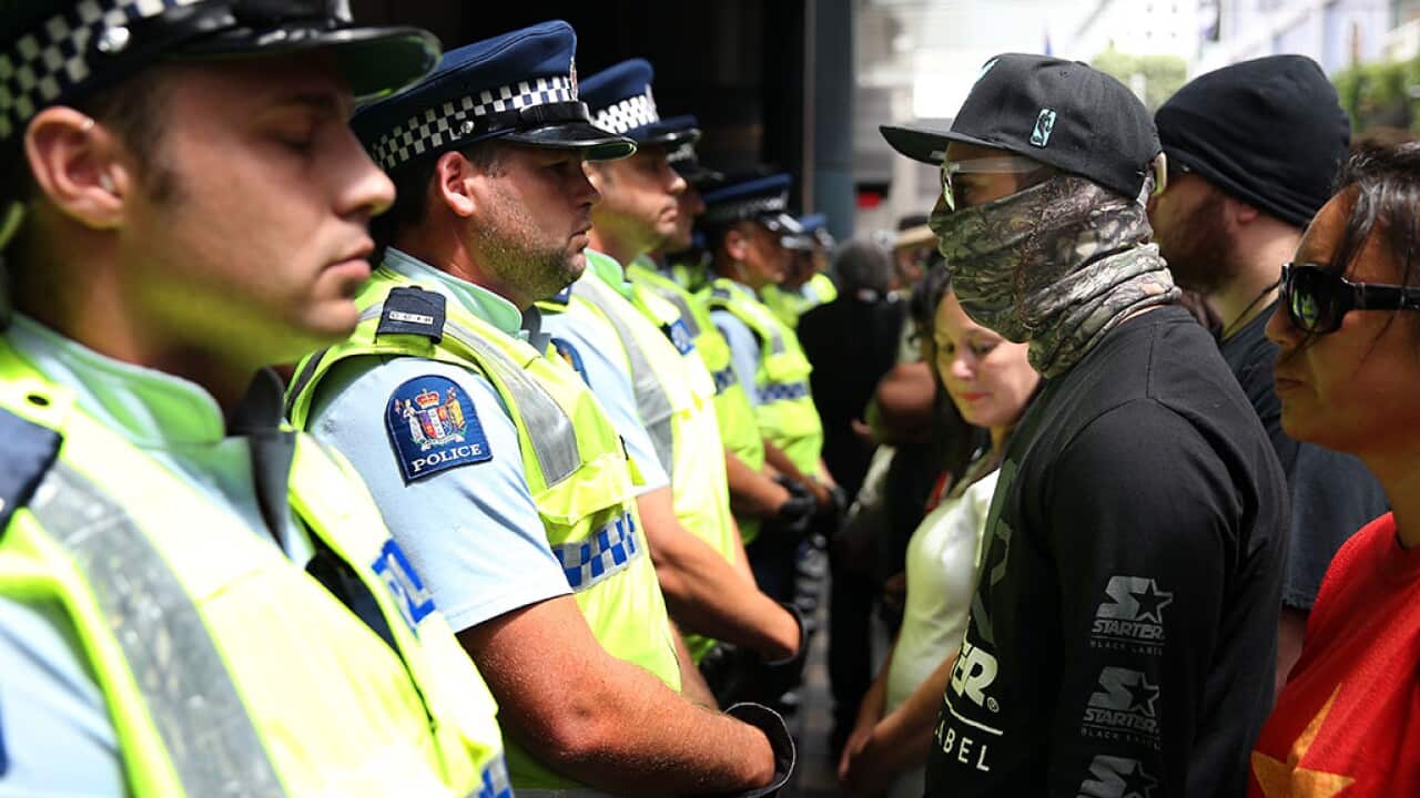 Protestors and police come face to face as protestors close down streets in the city to express their displeasure after the Ministerial Representatives from the 12 countries at the sign the TPP in Auckland on February 4, 2016. Source: Getty Images