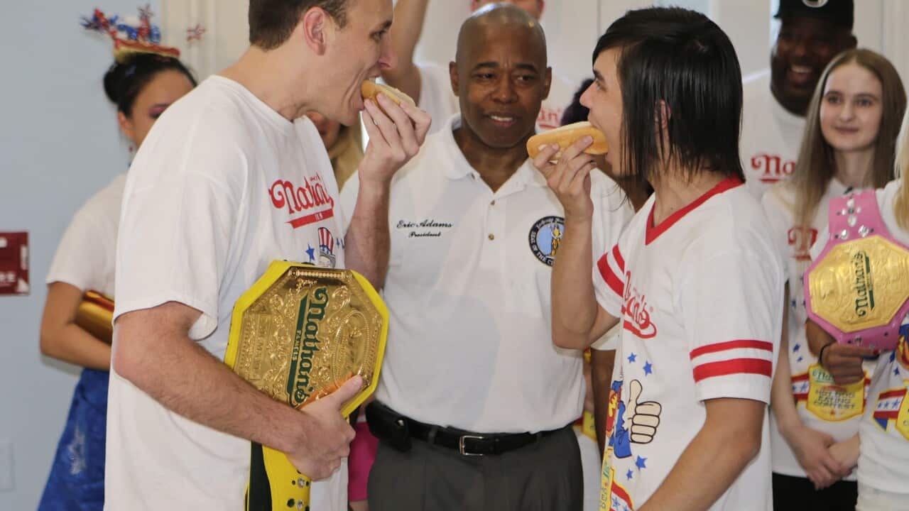 Joey Chestnut, right, is declared Nathan's Famous Fourth of July International Hot Dog Eating Contest winner, ahead of Stonie (left) Source: AAP